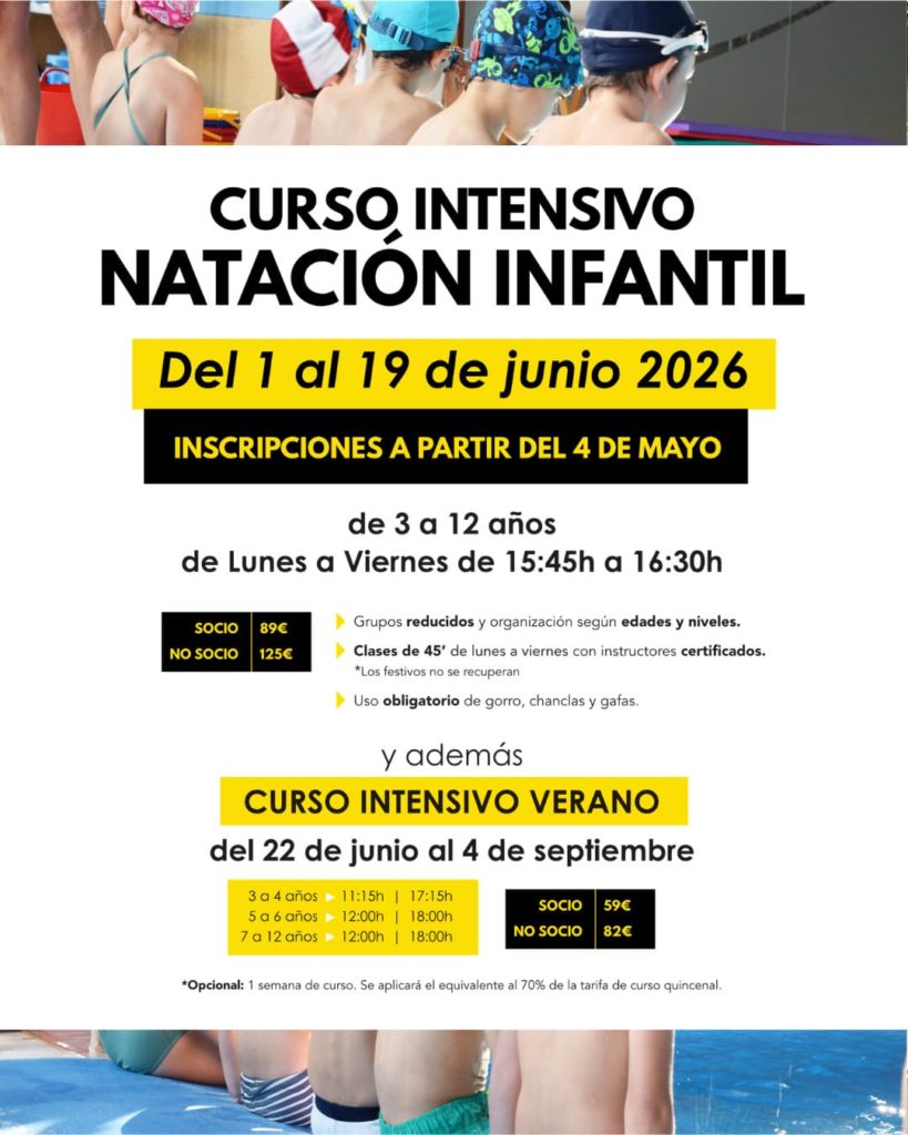 Programa de natación infantil, de lunes a viernes, que se desarrollará de forma continua del 1 al 19 de junio (3 semanas) en horario de tarde (15:45h).