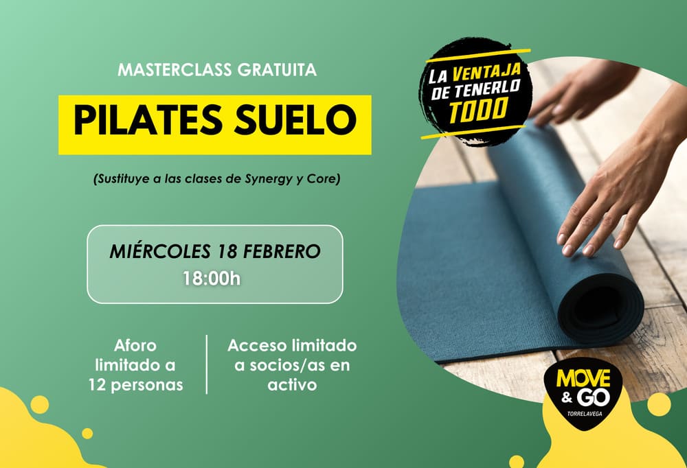 Además, el miércoles 18 hemos programado una sesión gratuita de Pilates Suelo, una de nuestras Actividades Plus. Será a las 18:00h (sustituye a las clases habituales de Synergy y Core de esa franja horaria), y el acceso estará limitado a las 12 primeras personas (solo socios) en registrarse.